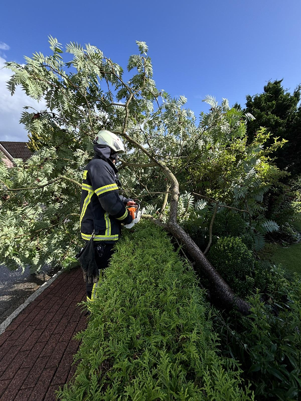 Vor Ort ist ein Baum auf ein Gehweg sowie die Straße gestürzt und musste mit einer Motorkettensäge zerteilt werden, um die Verkehrswege wieder freizuräumen.