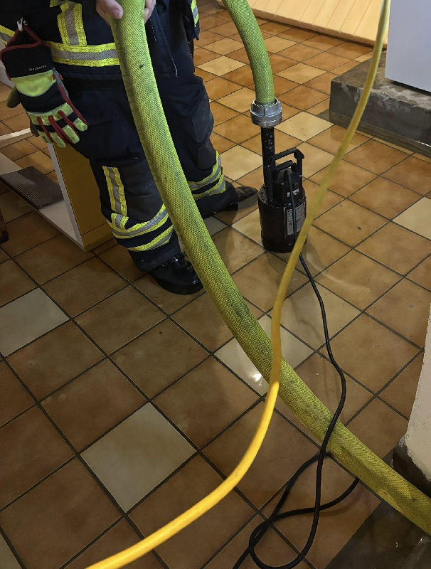Der Keller, der nach Eintreffen bereits ca. 15 cm hoch mit Wasser stand, konnte durch eine in Einsatz gebrachte Tauchpumpe nahezu vollständig gelenzt
