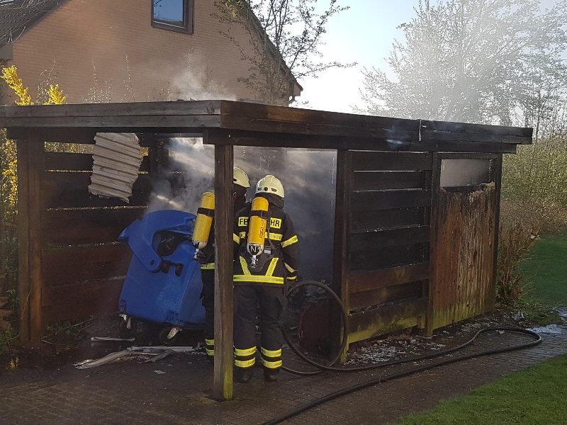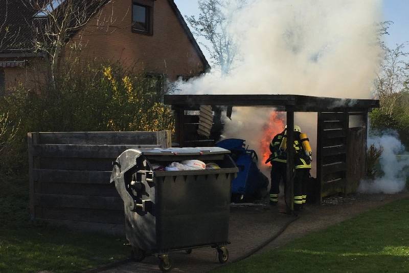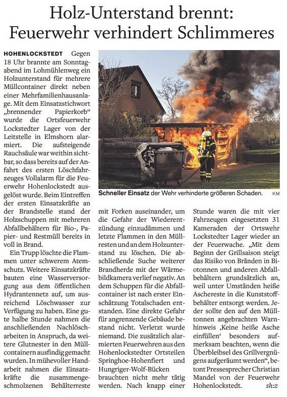 Gegen 18 Uhr brannte am Sonntagabend im Lohmühlenweg ein Holzunterstand für mehrere Müllcontainer direkt neben einer Mehrfamilienhausanlage. Mit dem Einsatzstichwort „brennender Papierkorb“ wurde die Ortsfeuerwehr Lockstedter Lager von der Leitstelle in Elmshorn alarmiert. Die aufsteigende Rauchsäule war weithin sichtbar, so dass bereits auf der Anfahrt des ersten Löschfahrzeuges Vollalarm für die Feuerwehr Hohenlockstedt ausgelöst wurde. Beim Eintreffen der ersten Einsatzkräfte an der Brandstelle stand der Holzschuppen mit mehreren Abfallbehältern für Bio-, Papier- und Restmüll bereits in Vollbrand. mehr->
