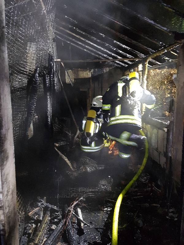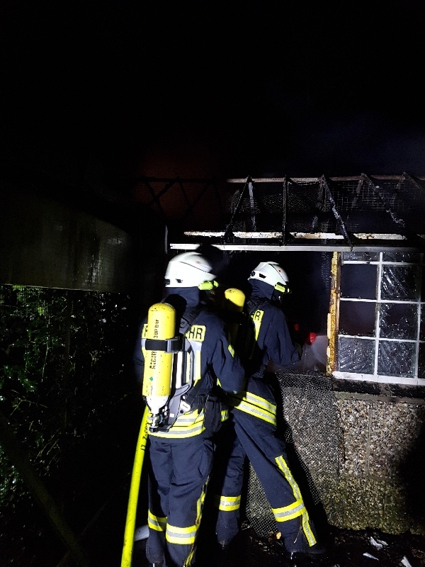 Beim Eintreffen der ersten Kräfte stand der Schuppen bereits lichterloh in Flammen und drohte auf die angrenzende Garage überzugreifen. Zwei Trupps unter Atemschutz gingen mit jeweils einem C-Rohr zur Brandbekämpfung vor, um den Brand unter Kontrolle zu bringen und ein übergreifen zu verhindern, nach gut 45 Minuten konnte bereits "Feuer aus" gemeldet werden. Um weitere Brandnester auszuschließen, wurde der Schuppen sowie die Garage und dessen Zwischendecke durch einen Trupp mithilfe der Wärmebildkamera überprüft.