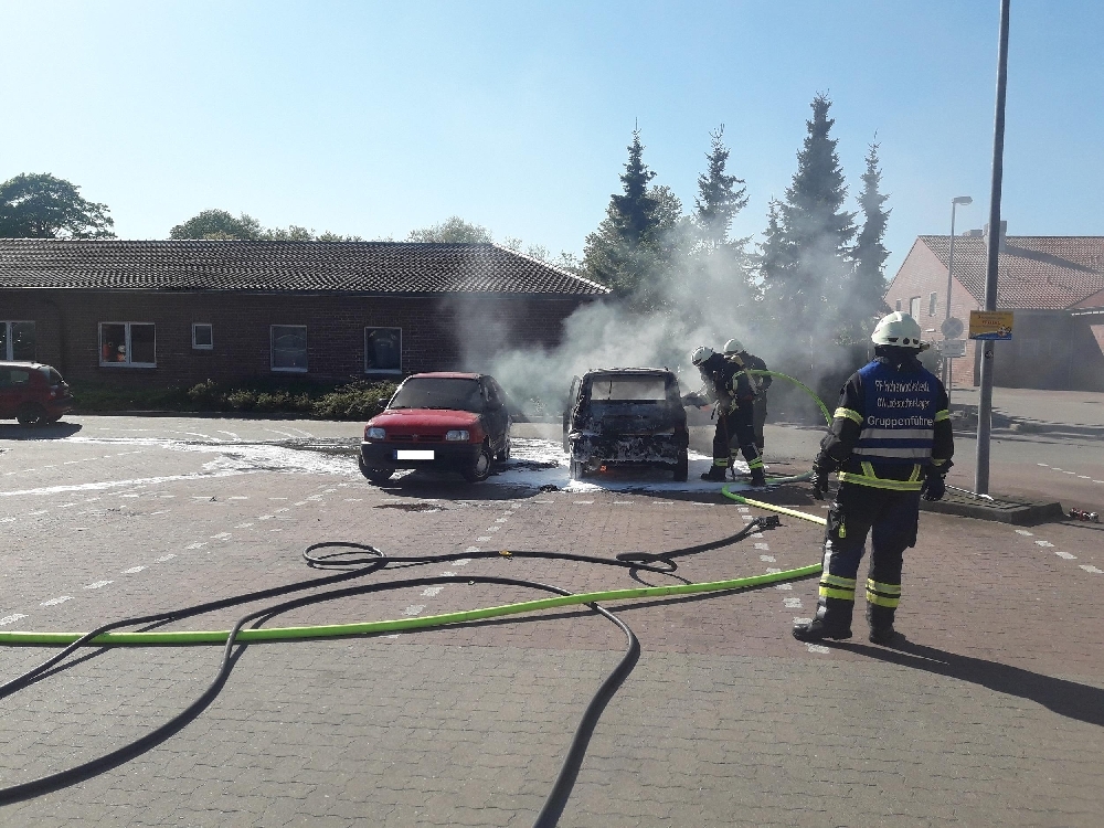 Vor Ort eingetroffen stand der Pkw bereits in Vollbrand, woraufhin das Feuer auf ein benachbartes Fahrzeug übergriff.