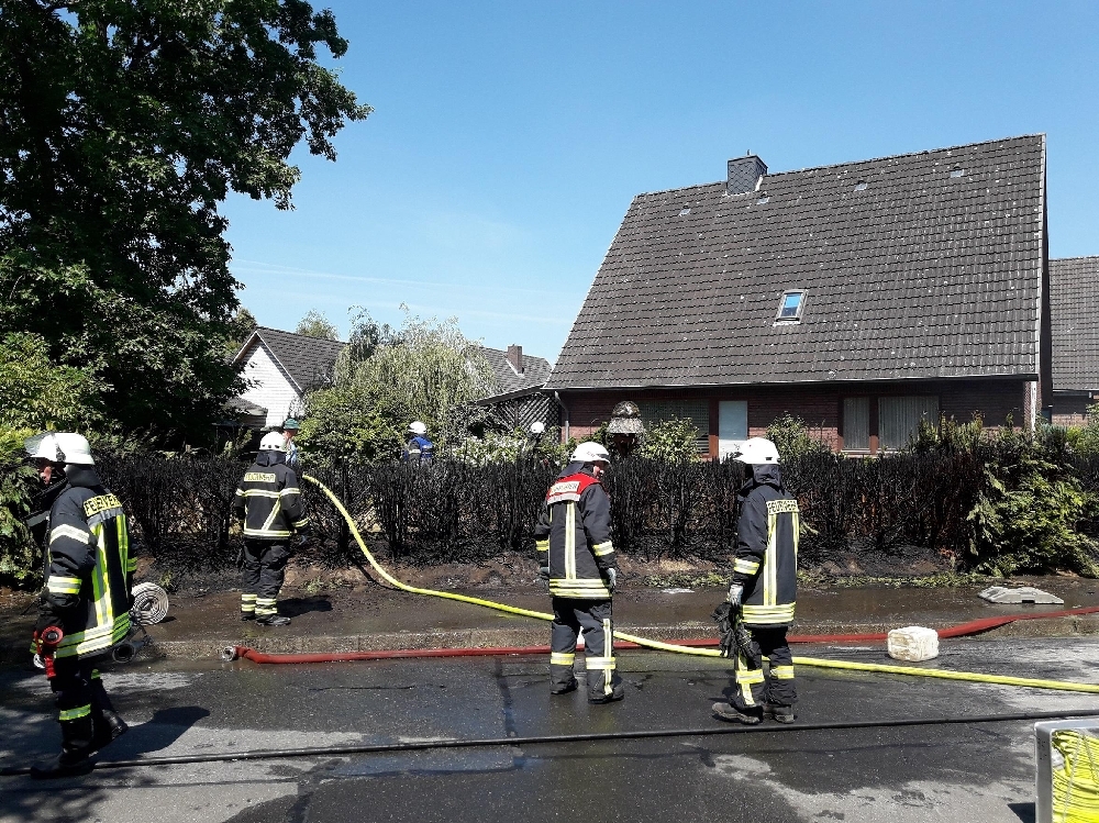 Durch Unachtsamkeit kam es gegen Mittag in der Deutsch-Ordens-Straße Ecke Breslauer Straße zu einem größeren Heckenbrand, bei dem auch eine Gartenrasenfläche in Brand geriet.