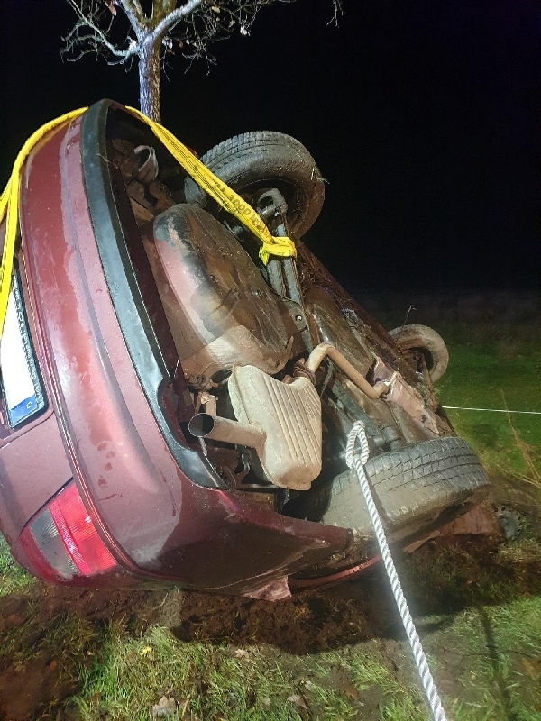 Ein Fahrzeug ist im Kurvenbereich von der Straße abgekommen, überschlug sich und kam dann in Schräglage an einem Baum zum Stehen.