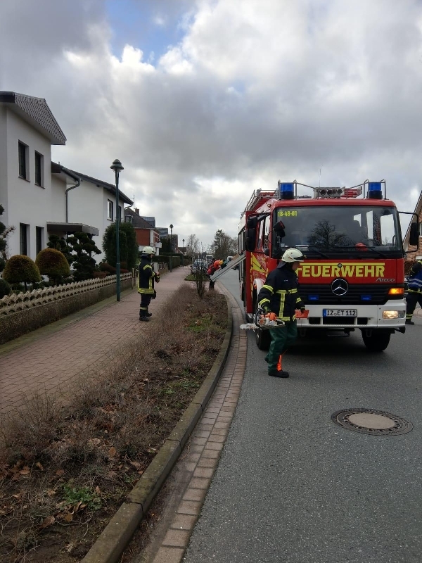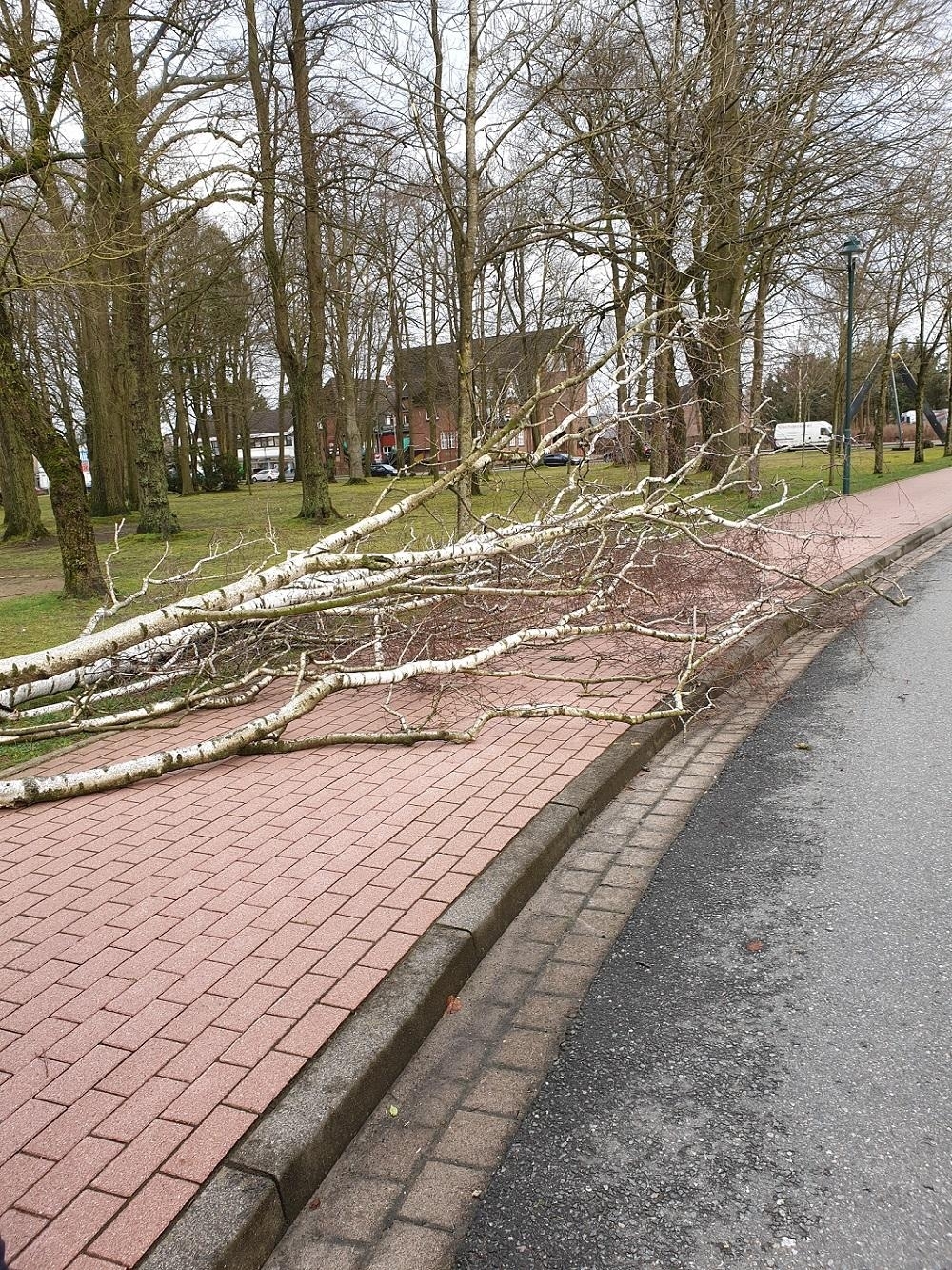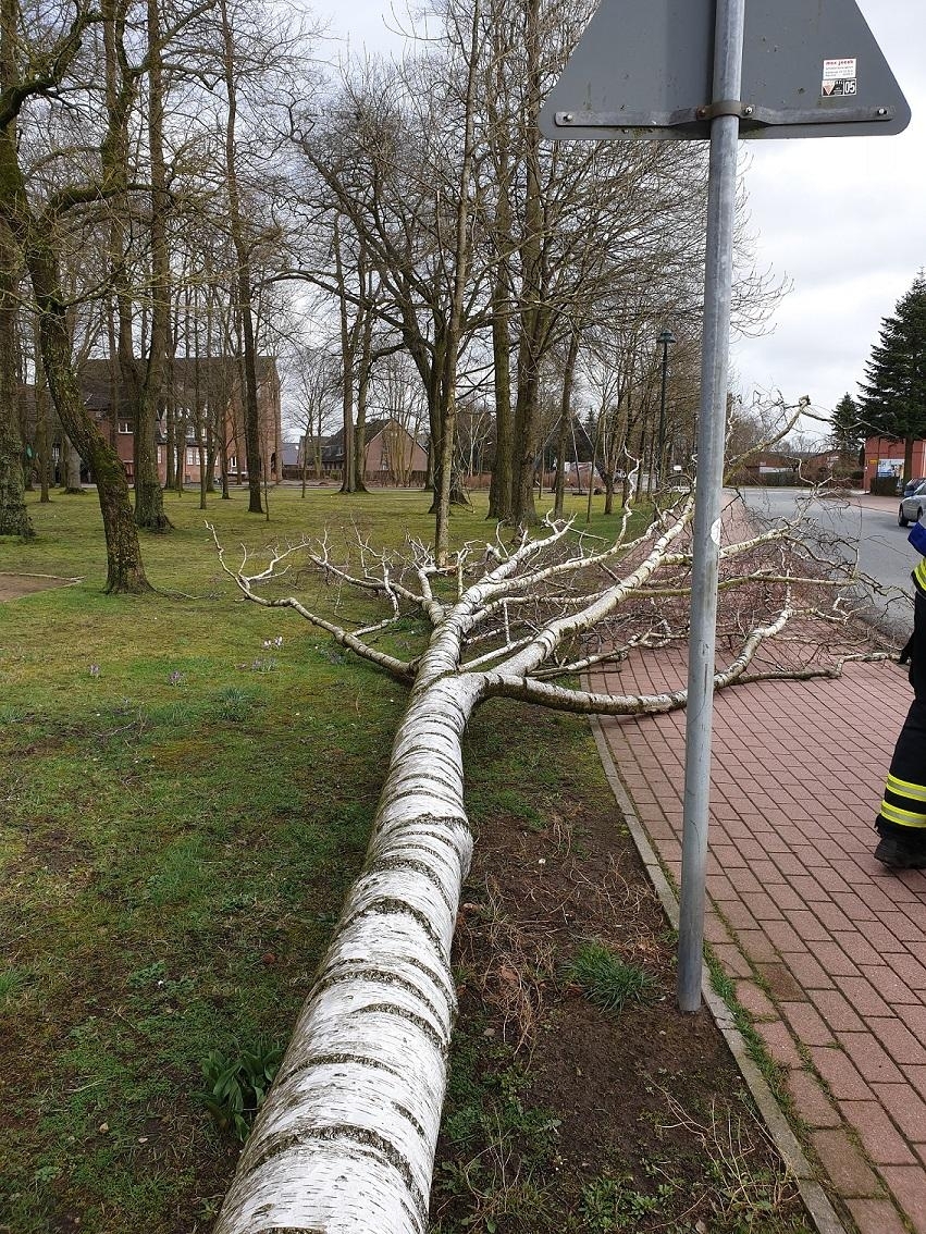 Eine Birke ist durch den starken Sturm auf einen Gehweg gestürzt und ragte zudem auf die Fahrbahn. Der Baum konnte mithilfe einer Motorsäge beseitigt werden.
