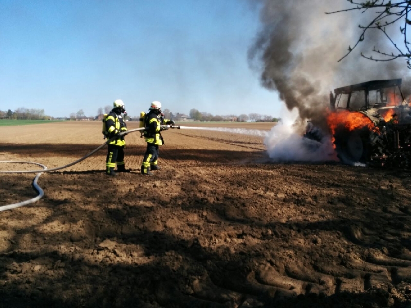 Trecker brennt auf Feld. Beim Eintreffen stand der Trecker bereits in Vollbrand.