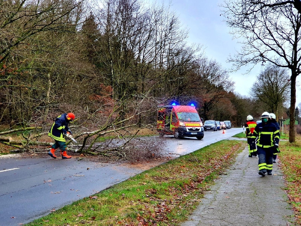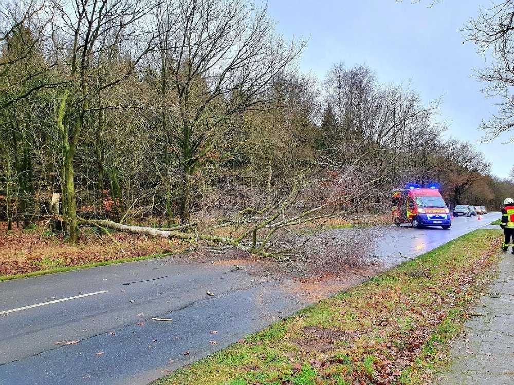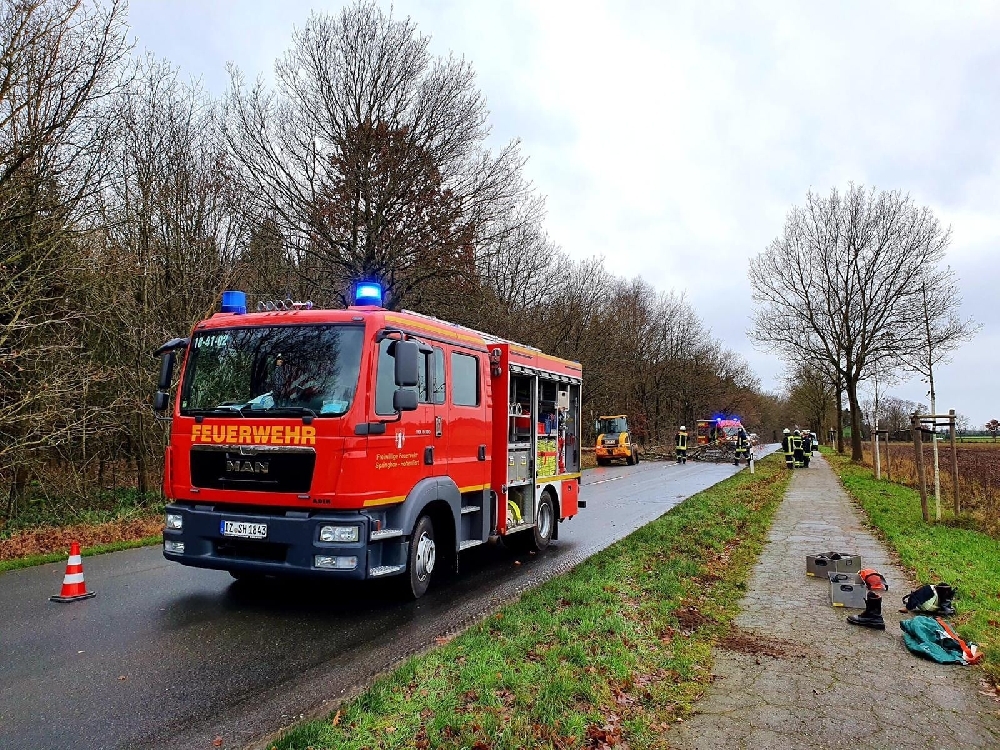 Durch den starken Sturm ist eine große Birke auf die Straße gestürzt und musste durch die zuständige Ortsfeuerwehr Springhoe-Hohenfiert mittels Motorsäge und mithilfe eines Radladers von dieser beseitigt werden.