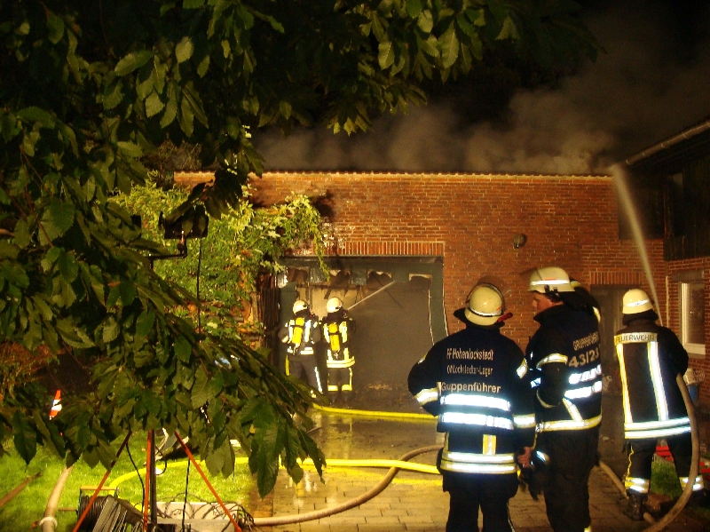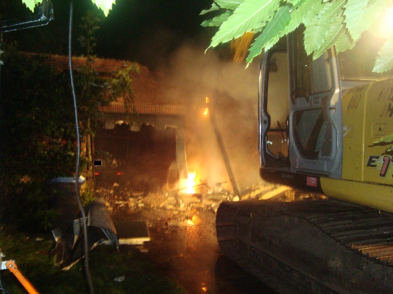 Als die ersten Einsatzkräfte vor Ort eintrafen, breitete sich der Brand bereits langsam und unbemerkt in der Zwischendecke der Garage zum angrenzenden Einfamilienhaus aus und entzündete sich dort.