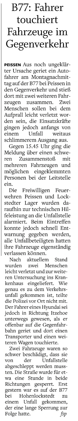 Um 15:45 Uhr wurden wir zusammen mit der FFw Peissen zu einem Verkehrsunfall mit mehreren Fahrzeugen auf die Bundesstraße 77 alarmiert.